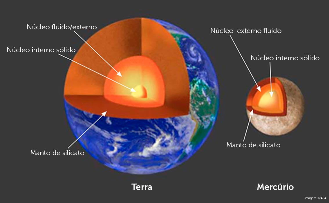 No ano de 2007, pesquisadores usaram radares terrestres, estudaram o núcleo e encontraram evidências de que ele está parcialmente fundido (líquido). O invólucro externo de Mercúrio (chamado manto e crosta) tem cerca de apenas 400 km de espessura.