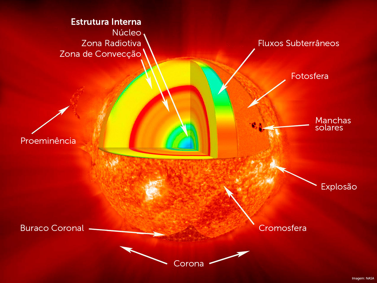 O Sol possui seis regiões. No seu interior tem o núcleo, a zona radioativa e a zona convectiva. Na superfície visível, a chamada Fotosfera, a Cromosfera e a região ultraperiférica, a coroa.