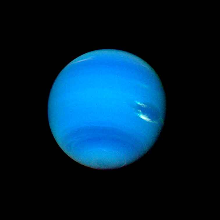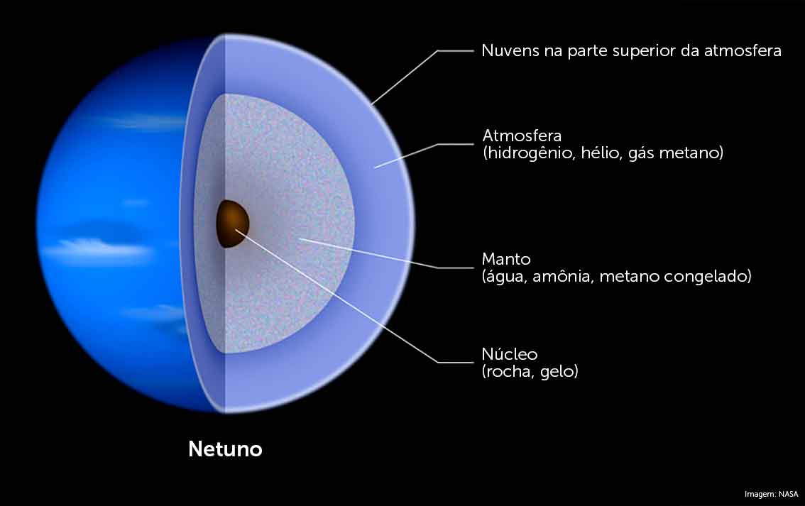 Conhecido como um gigante de gelo, Netuno apresenta uma atmosfera com extensa profundidade. Os cientistas apontaram a presença de Hidrogênio, Hélio, Deutério, Etano e Metano, esse último pode ser o responsável por sua coloração azul. Essa atmosfera profunda, funde-se gradualmente em água e gelo derretido até o núcleo; seu núcleo mais sólido e mais pesado tem aproximadamente o tamanho da Terra, contendo rocha e gelo.